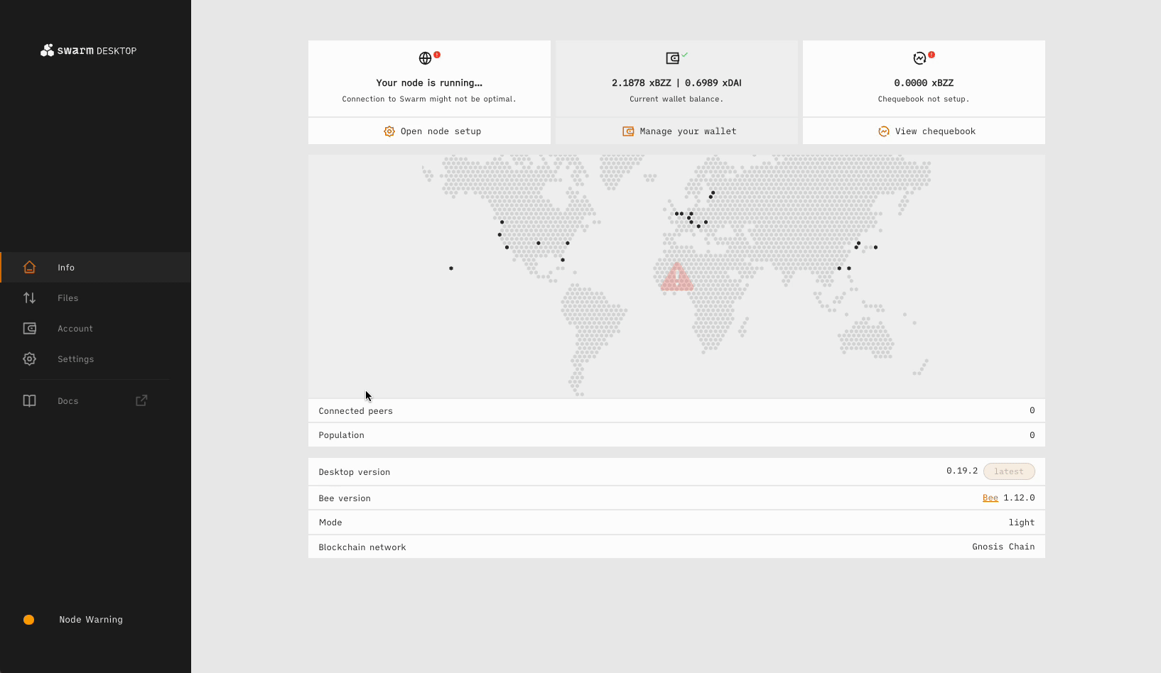 First, download and install the Swarm Desktop App. Next, add xDAI (transaction fees) to your Node Wallet address. If you possess xBZZ (storage fees), you can deposit it alongside the xDAI. Otherwise, you can exchange your xDAI for xBZZ using the Swarm Desktop app.